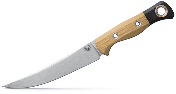 Benchmade Meatcrafter Cutlery har ett CPM-154-blad med en stonewash-finish, ett Richlite-handtag av lönn och en svart G10-förstärkning accentuerad med en guldring.
