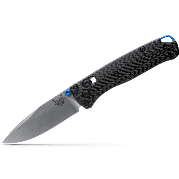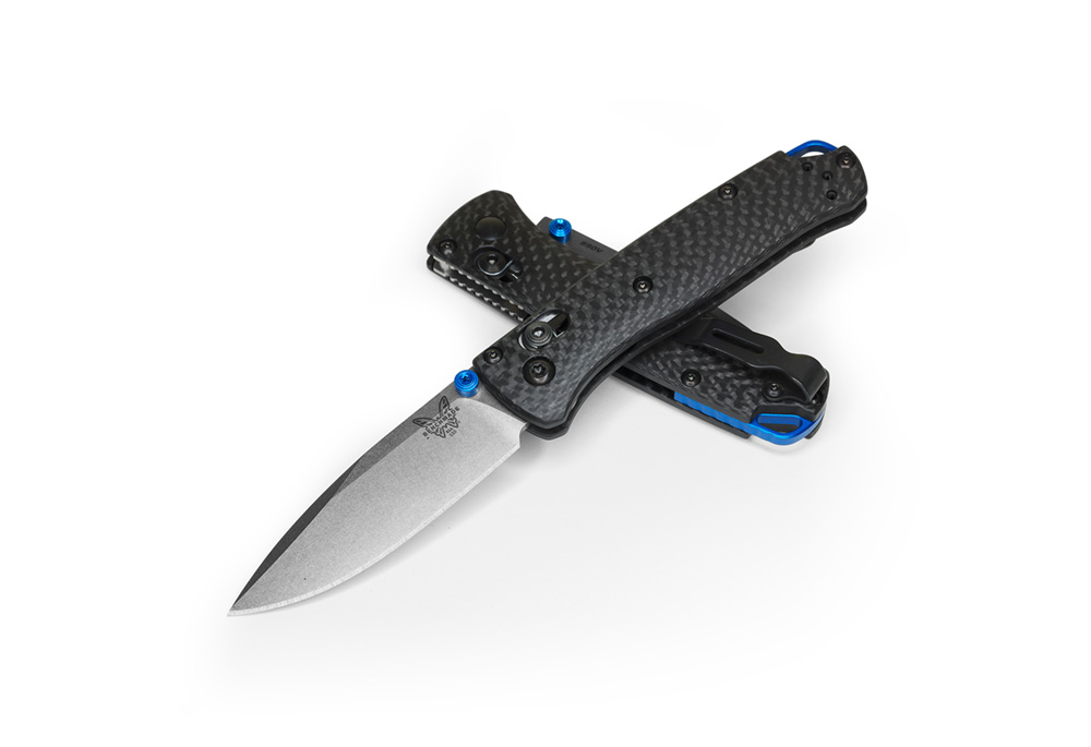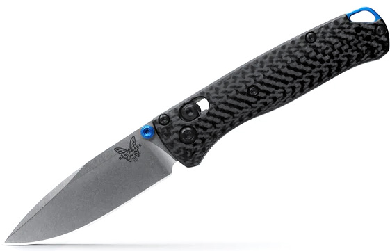 Benchmade 533-3 Mini Bugout har ett oslagbart CPM-S90V superstål och ett fräst kolfiberhandtag med en blå eloxerad back-spacer.