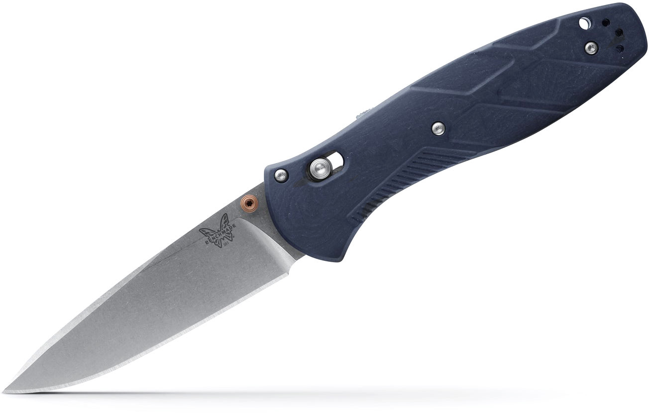 AXIS LOCKBenchmades fällknivar är utrustade med en genial låsmekanism som av många rankas som nr. 1. Fördelarna i Axis-lock ligger i snabbheten, hållbarheten och säkerheten. Snabbheten kan jämföras med fjäderassisterad modell (som inte får säljas i Sverige), med fördelen att man med bara en hand lika snabbt fäller in bladet. Tryck in knappen, gör en lätt knyck och bladet åker in, eller ut. Låset är helt oberoende vilken hand du håller kniven i.