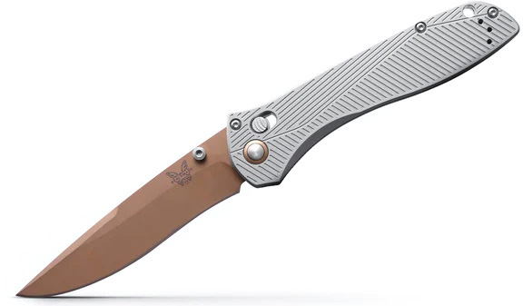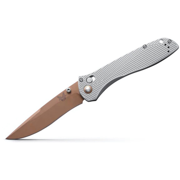 Med ett elegant, drop-point blad tillverkat av mäktigt CPM S9OV-stål med en FDE PVD-finish, har 710FE-24 ett fantastiskt lättviktigt 6061-T6 aluminiumhandtag med grå anodiserad finish, frästa FDE PVD-distanser, clip och pivotring, samt satin tumskruv och AXIS®-lås.