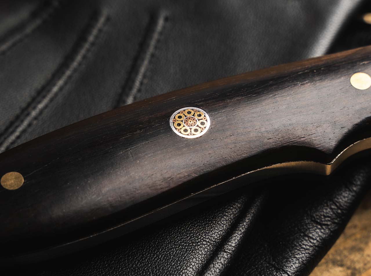Det eleganta utseendet avrundas av de kontrasterande mässingsdubbarna i handtaget, varav den mittersta i synnerhet sticker ut i ett omsorgsfullt utformat mosaikmönster.