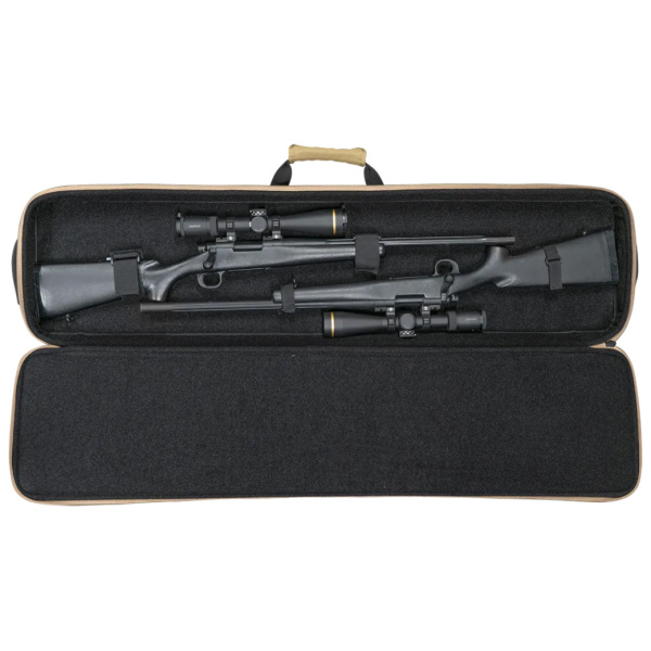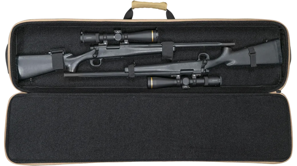 Leupold Rendezvous Rifle Case med en semi-rigid EVA-botten ger Rendezvous Rifle Case ett robust skydd utan att kompromissa med portabiliteten. Dess 900D nylon avvisar fukt, och den vadderade öglbeklädda insidan skyddar din utrustning, även under långa resor över ojämn terräng. Ovanpå väskan finns ett förstärkt grepphandtag för enkel lastning, medan de främre facken kan förvara allt du behöver för en lyckad dag på skjutbanan.